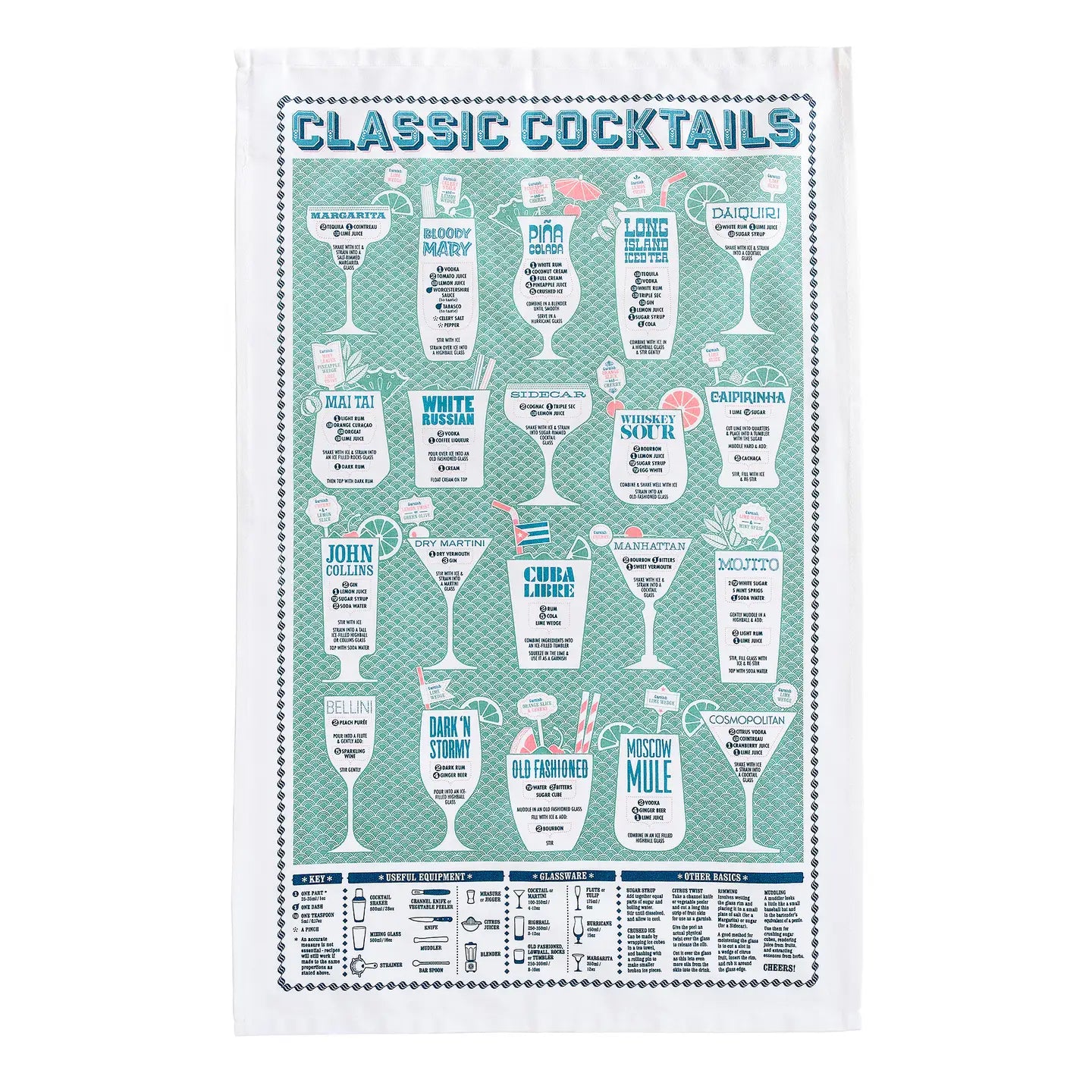 Mix Iconic Cocktails with This Classic Cocktails Tea Towel Raise the bar with this ultimate guide to 20 iconic cocktail recipes, printed on a 100% cotton tea towel. Featuring essential information on glassware and equipment, it’s perfect for budding mixologists and cocktail enthusiasts alike. Made in Britain, this stylish and practical tea towel is ideal for every home bar.