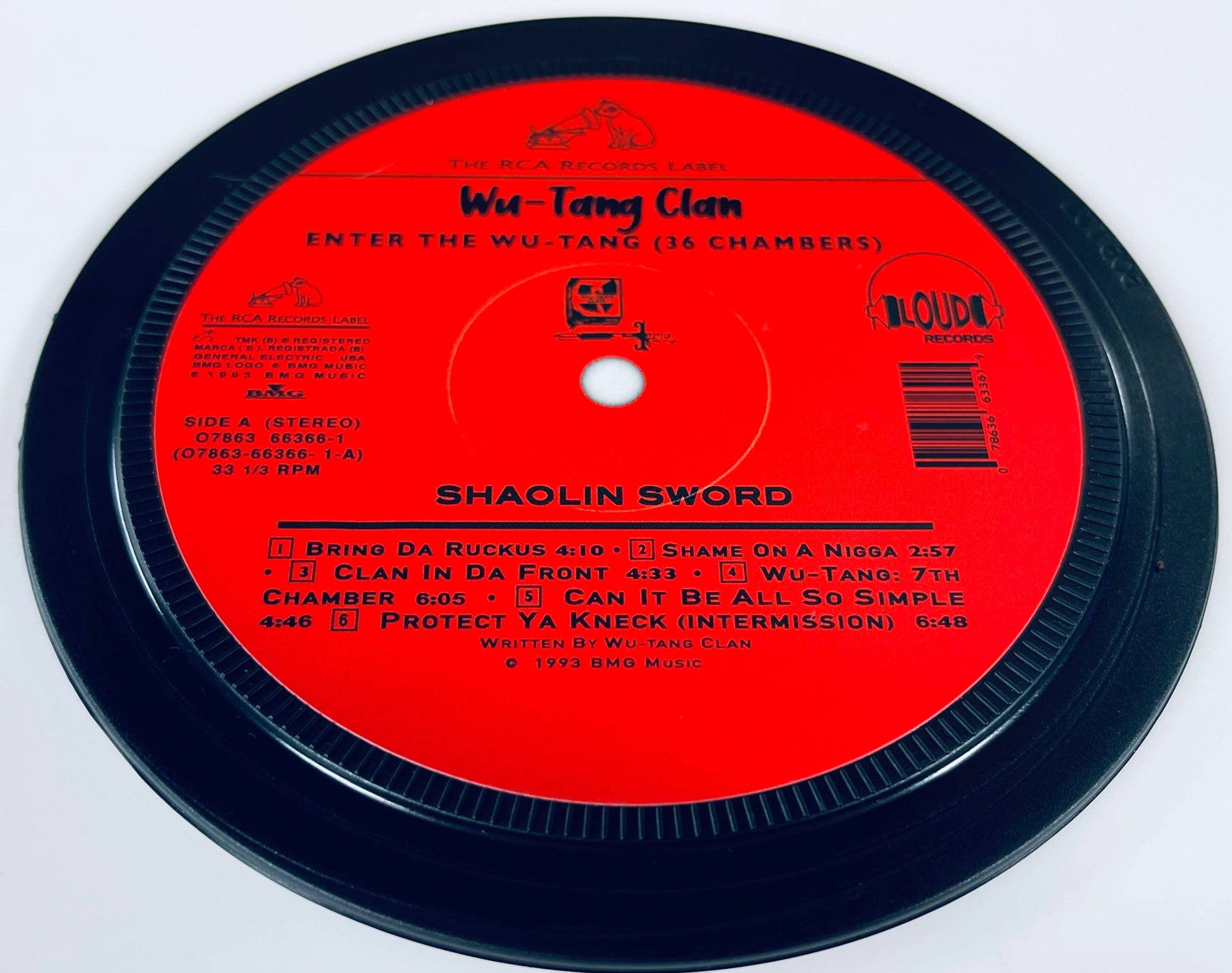 Waterproof vinyl label on a disc that replicates the middle of a vinyl record, with the 'teeth' and run out groove.